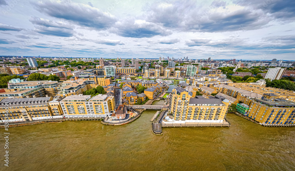 Aerial view of the Limehouse, a regenerated former dockland area at the River Thames in London