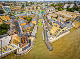Aerial view of the Limehouse, a regenerated former dockland area at the River Thames in London