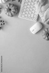 Autumn office workspace. Keyboard, laptop, notebok with autumn clothes and fall decorations - pumpkin, leaves and other. Fall flat lay.