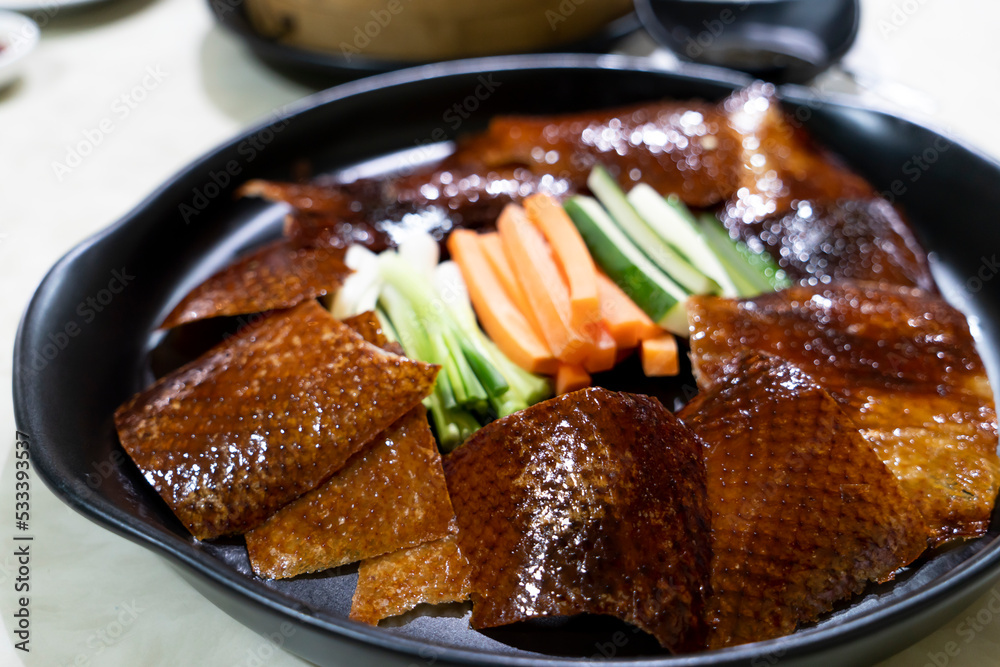 Roast Duck Skin (peking duck) Chinese food recipes on the table in a restaurant