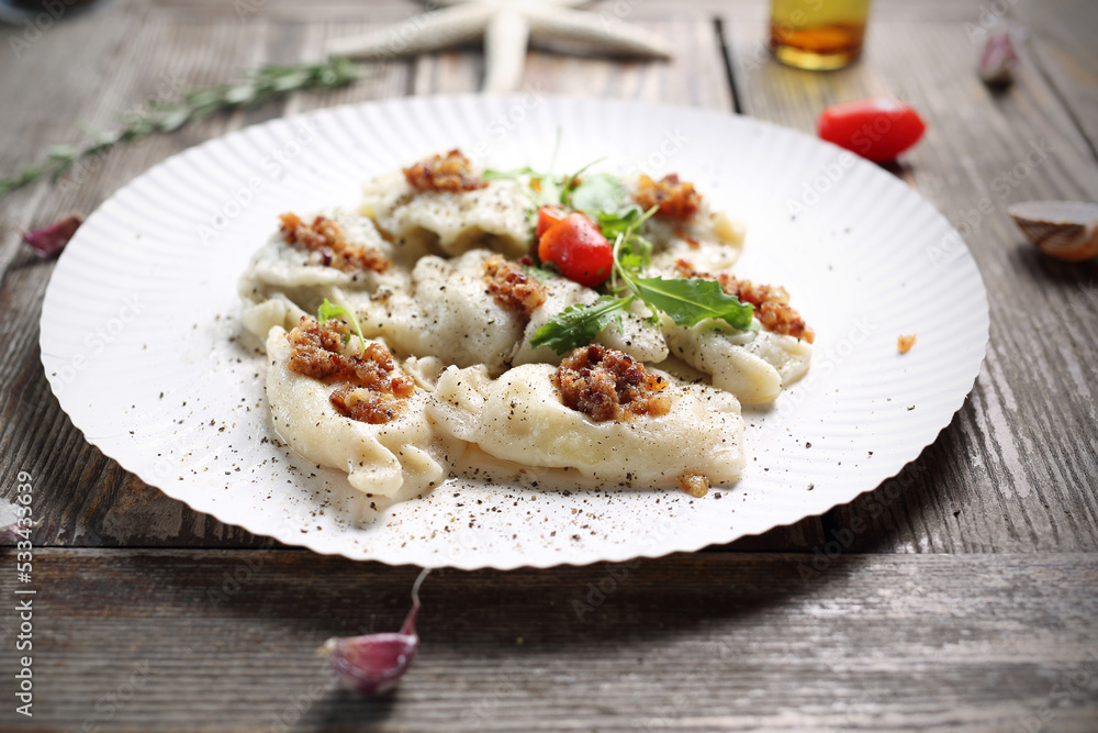 Polish pierogi, on a plate, selective focus, close-up. Traditional dumplings topped with fried onion and bacon gravy.