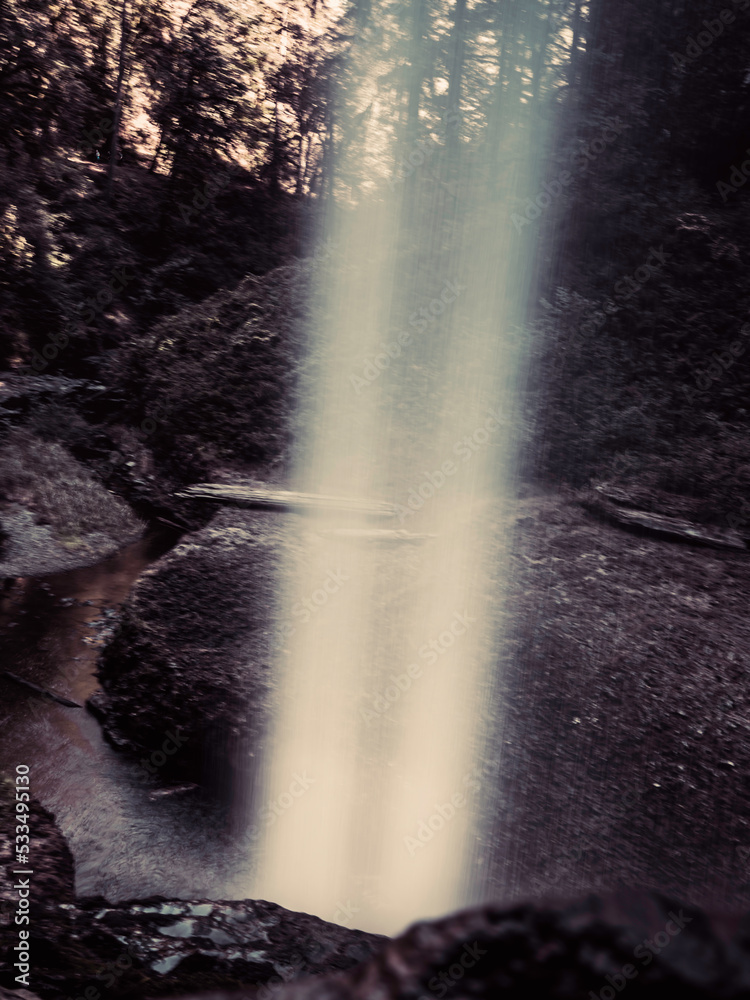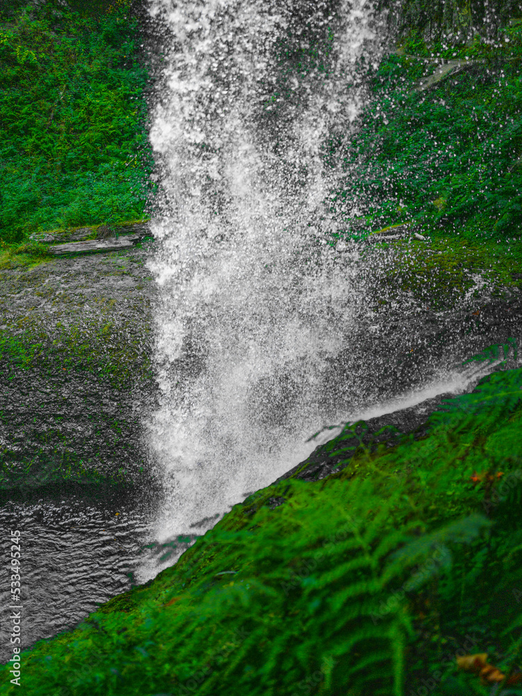 White column of the waterfall on the rocky brook in the morning in the rainforest of Silver Falls State Park, Oregon