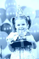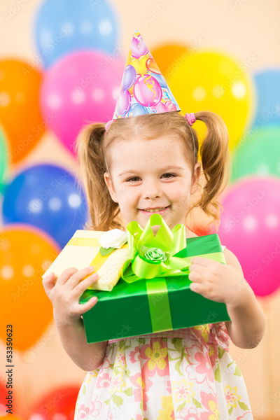 smiling child girl with gidts on birthday party