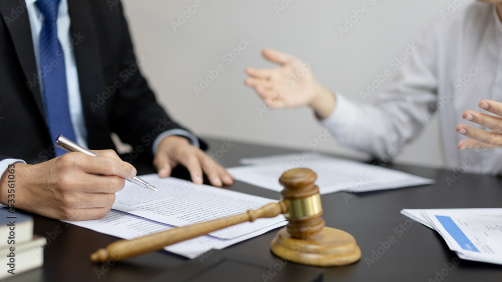 Client describes the money fraud problem and discusses the solution with a lawyer in the litigation room, Ethics in the courts include justice, legal consultant, Scales of justice, Litigation.