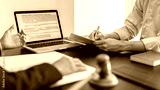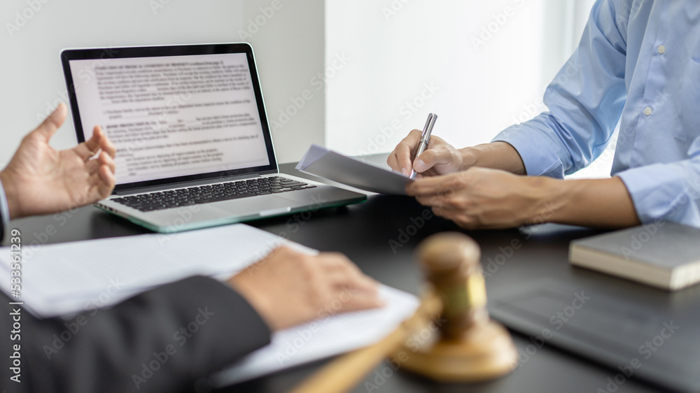 Lawyer or judge has recommend a client sign a legal agreement in the courtroom, Legal Agreement Documents and Business Litigation Forms, scales of justice, law hammer, Litigation and legal services.