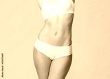 Young, fit and beautiful blond woman in white swimsuit isolated on grey. Healthcare, diet, sport and fitness concept.