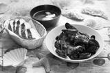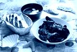 Mussels in tomato sauce, served with bread. Clams in a bowl, on white wood background.