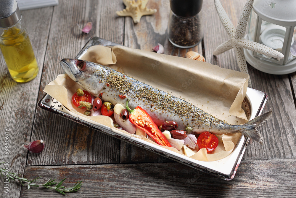 Raw mackerel with vegetables and spices in a baking dish, top view. Baking fish in a sheet pan with parchment paper.