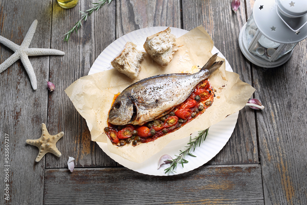 Roasted sea bream served with vegetables, on a plate, top view. Whole, baked fish on a parchment paper.