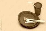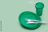 Disposable green plates, glasses for drinks and cutlery on a green background, paper napkins. Plastic recycling.