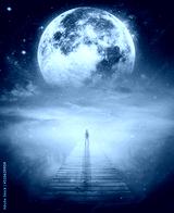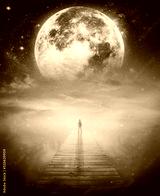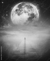 Super moon approaches the Earth, surreal scene and a lone man on the pier watching the fabulous cosmic phenomenon. Mysterious space wonder, fantastic adventure concept. Beautiful twilight scenery