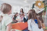 Reading time in an elementary school or kindergarten, a teacher reads a book to children in an elementary school or kindergarten. The concept of pre-school education. Selective focus
