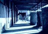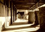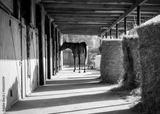 Stable, horse silhouette. Hay bales, sunset. Polish Arabian horse