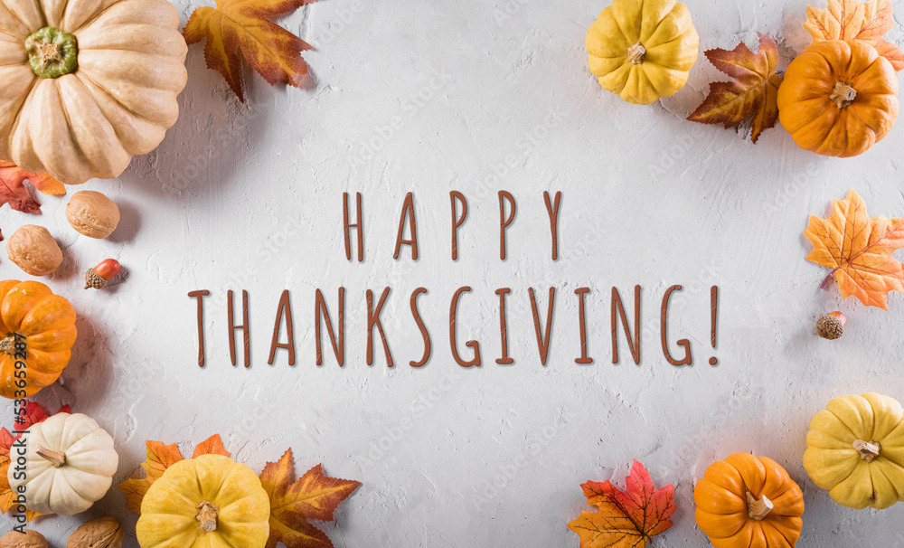 Thanksgiving and autumn decoration concept. Pumpkin, autumn leaves and apple with the text on stone background.