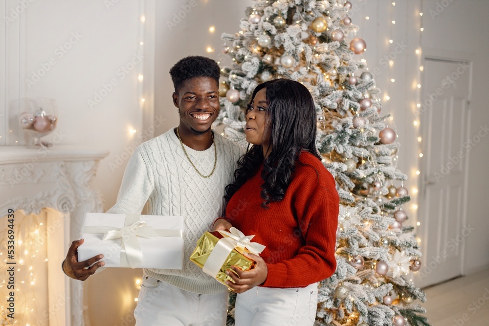 Portrait of happy black couple holding gifts and standing near Christmas tree