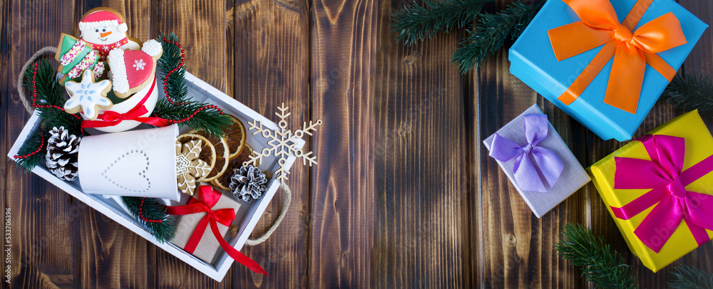 Christmas banner. Christmas gingerbread in the white tray and gift box on on the wooden background. Top view. Copy space.