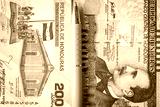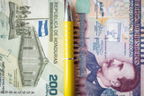 financial settlements in Honduras, concept, 200 and 500 Lempiras banknotes stacked next to each other, yellow pen between them, taxes in Honduras, close-up, top view