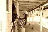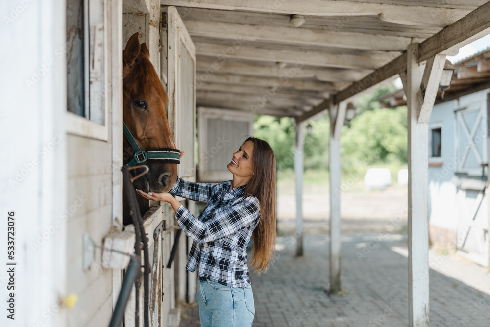 Young woman in a stable with her horse
