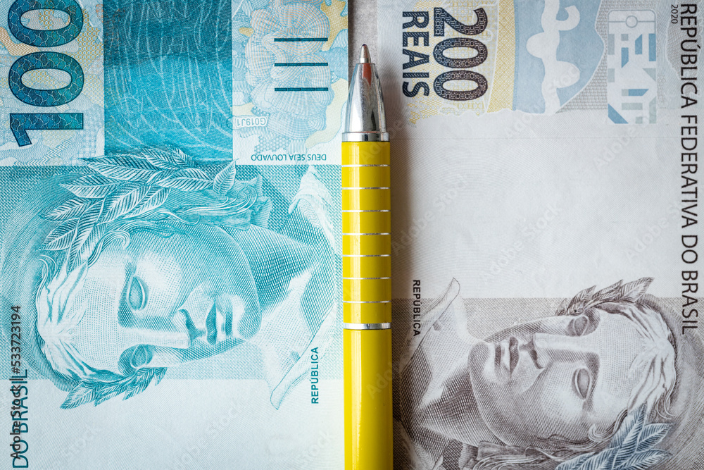 financial settlements in brazil, concept, 100 and 200 reais banknotes stacked nicely side by side, yellow pen in the center, close-up, top view