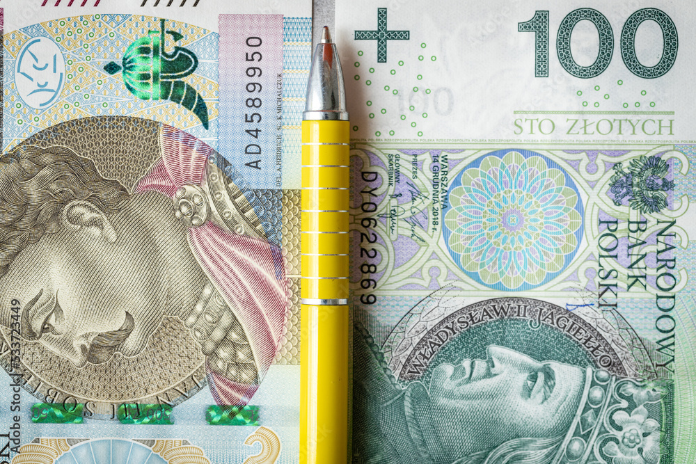 financial settlements in Poland, concept, banknotes 100 and 500 Polish zlotys stacked next to each other, between them a yellow pen, taxes in Poland, close-up, top view