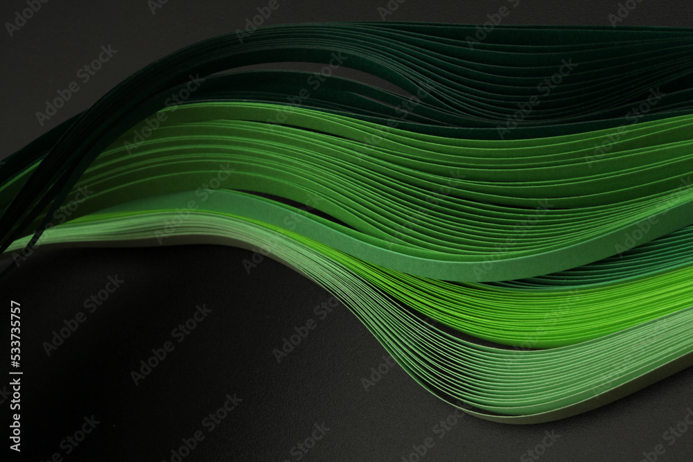 Texture green color strip wave paper on black. Abstract horizontal background.