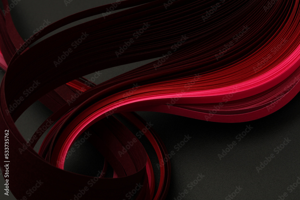 Texture red color strip wave paper on black. Abstract horizontal background.