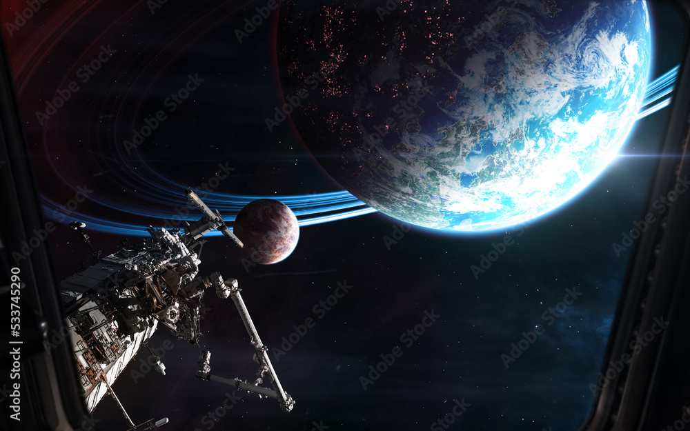 Deep space planets, space station. View from porthole. Science fiction. Elements of this image furnished by NASA