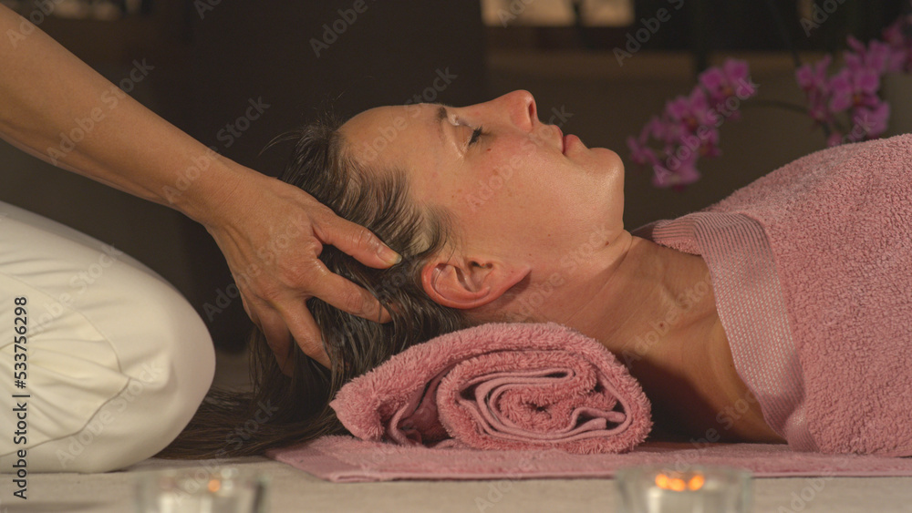 CLOSE UP: Beautiful woman enjoying at relaxing head massage with her eyes closed