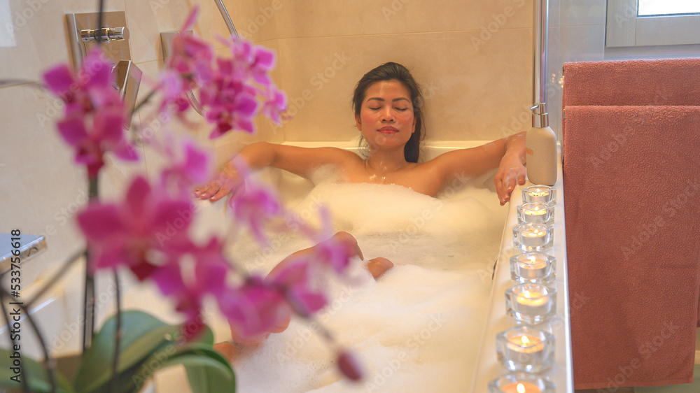 Beautiful blooming purple orchid flower with young lady relaxing in bubbly bath