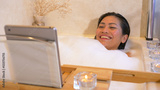 CLOSE UP: Beautiful Philippine woman watching comedy while relaxing in bathtub