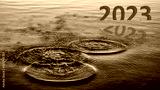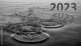 Happy New Year 2023 is coming. Transition from 2022 to new year concept with 2023 text on sea. High resolution photo image can be used as large display, print, website banner, social media post.