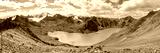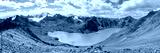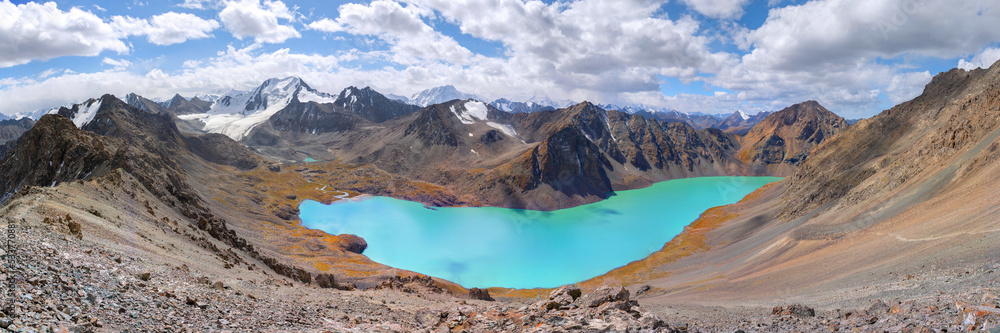 Panoramic landscape with lake and mountains; heart in the mountains, Ala-kul lake from Ala-kul pass during hike near Karakol in Kyrgyzstan