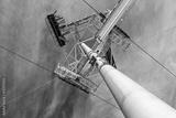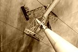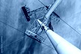 Bottom up overhead view of big metal pillar with Ski lift ropeway crossroad intersection on hilghland alpine mountain winter resort on sunny day. Ski chairlift cable way with people enjoy skiing