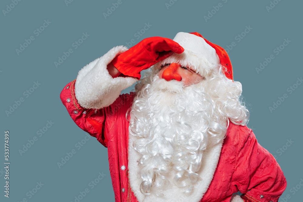 Front view Santa Klaus with red nose put hand to his forehead and looks into the distance a thoughtful attentive look. Father Christmas with lush white beard stands on a blue background of the studio.