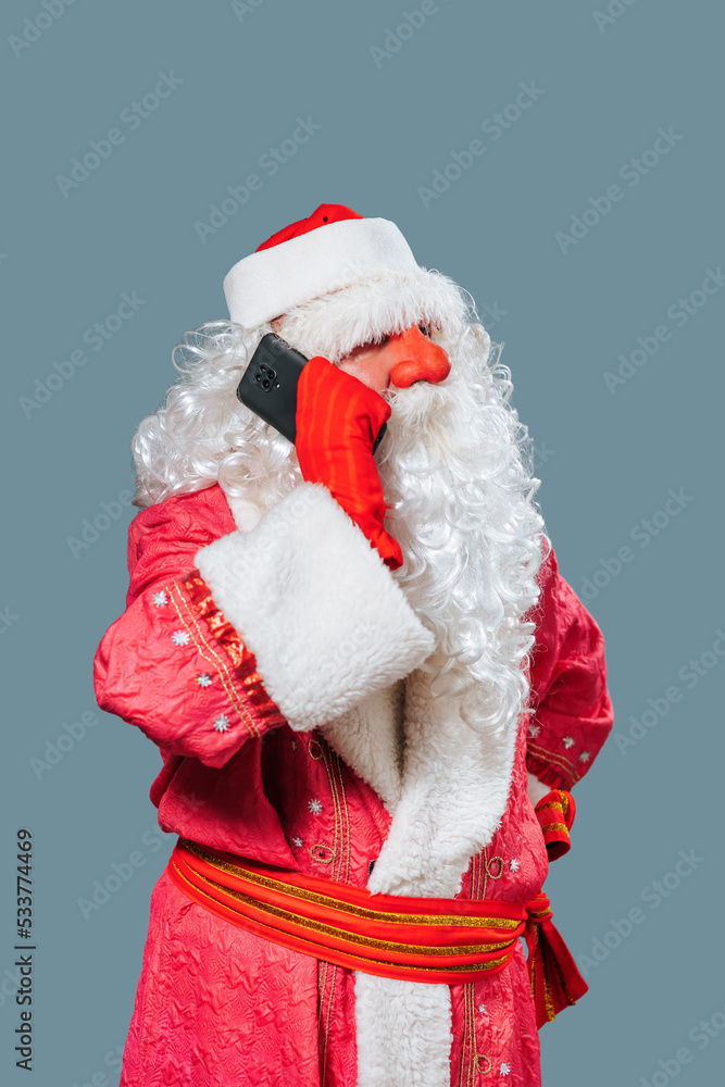 Looking into the camera on a blue background close up front view portrait of Santa Claus speaking on the smartphone. Father Frost decides important matters on the eve of Christmas and New Year.