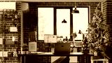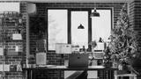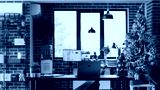 Festive decorated workplace with laptop on desk, christmas tree and lights as winter season decorations. Empty office filled with seasonal ornaments used to celebrate xmas holiday.