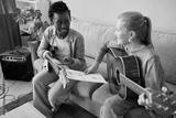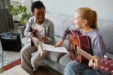 High angle portrait of two young woman playing guitars together and composing song music