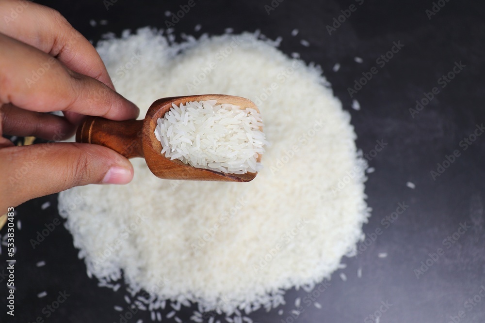 Uncooked rice with a wooden spoon. Raw surti kolam rice over black background. copy space.