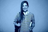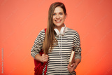 Smiling university student in striped shirt with headphones holding book and red backpack. Isolated happy woman portrait on pink background.