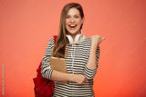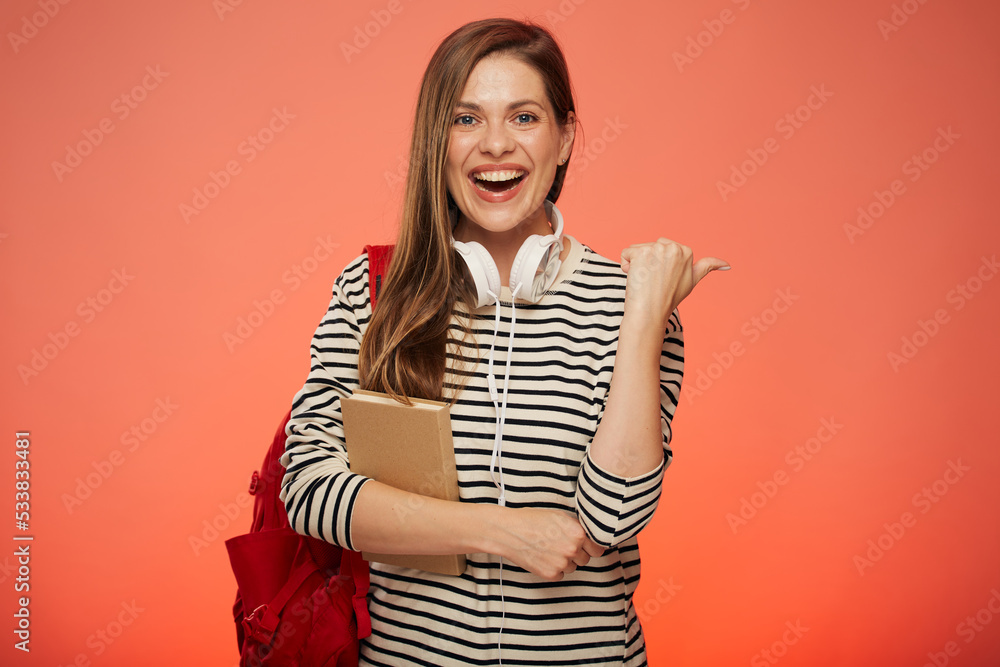 Smiling student with book and red backpack pointing finger away. isolated female portrait on pink background.