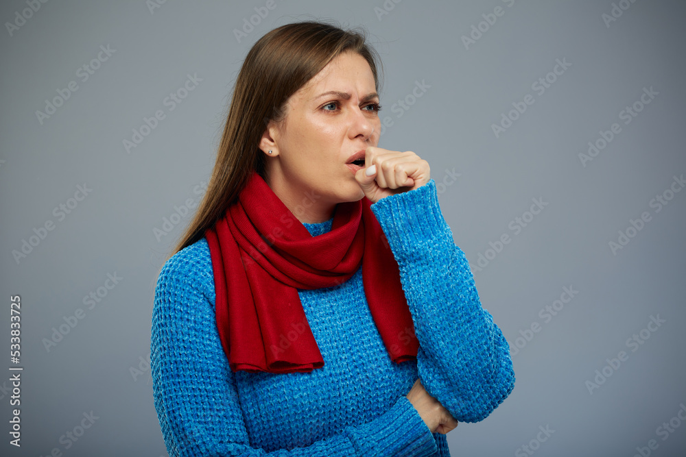 Sick coughing woman with allergy or flu, cold symptoms isolated portrait.