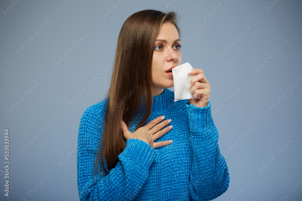 Coughing woman isolated portrait on blue.