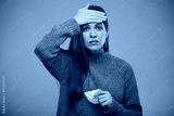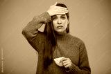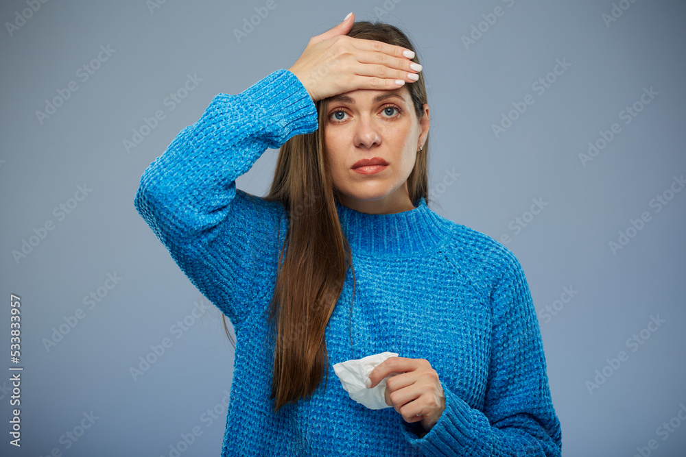 Sick woman with fever touching her forehead. isolated portrait female person.