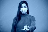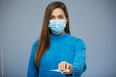 Woman wearing blue medical mask showing thermometer. Health and medical isolated concept portrait.