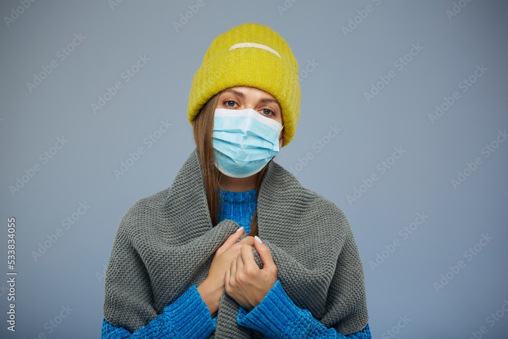 Young modern woman in warm clothes wearing blue medical mask. isolated portrait