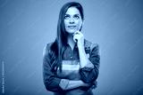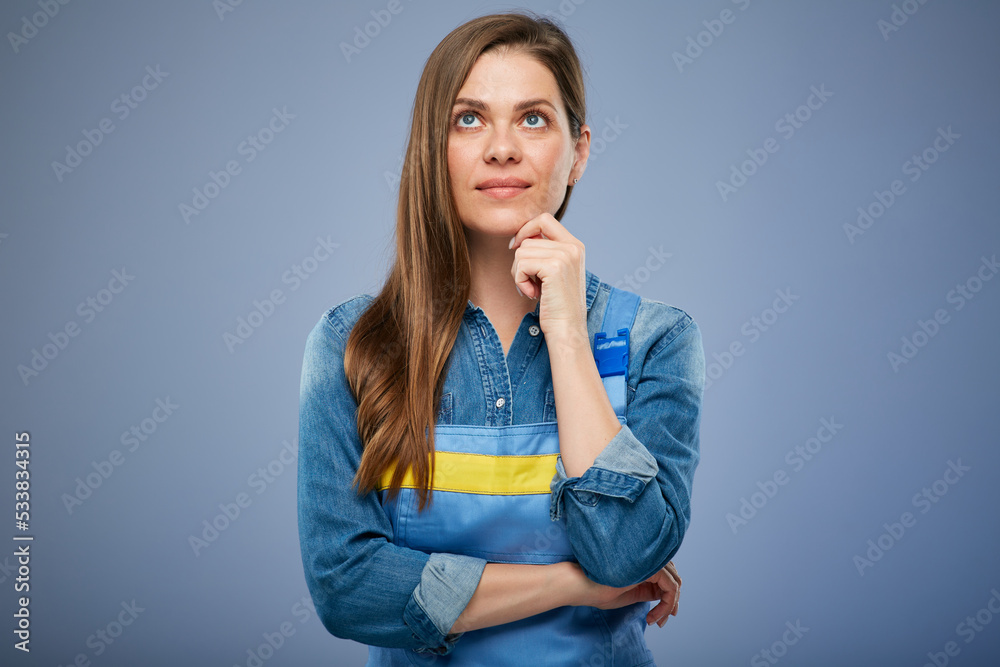 Smiling thinking woman in blue overalls looking up. Isolated female portrait in builder worker uniform.