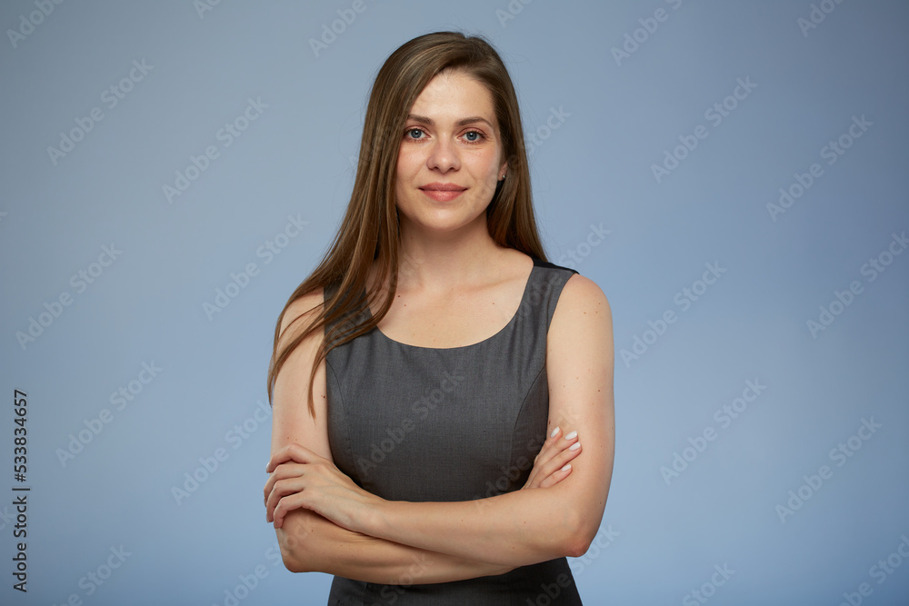 Serious confident business woman in gray business dress with arms crossed. Isolated female portrait.