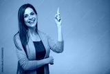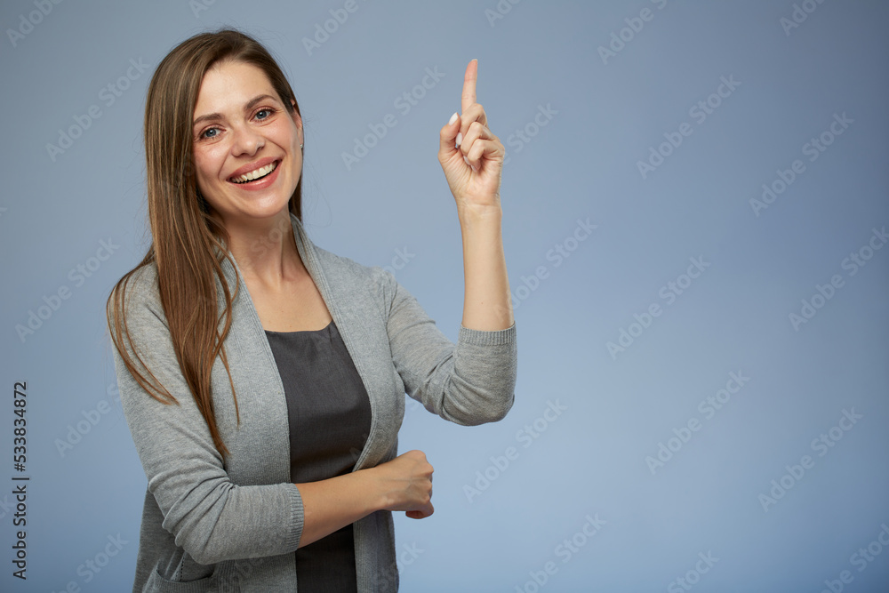 Smiling business woman pointing up with finger. isolated portrait on blue background.