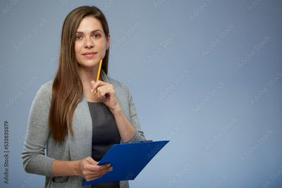 Smiling accountant with clipboard for tax report or social survey. Isolated portrait.