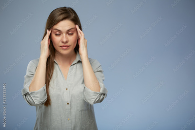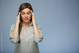 Young woman with headache touching head. isolated female portrait with eyes closed.